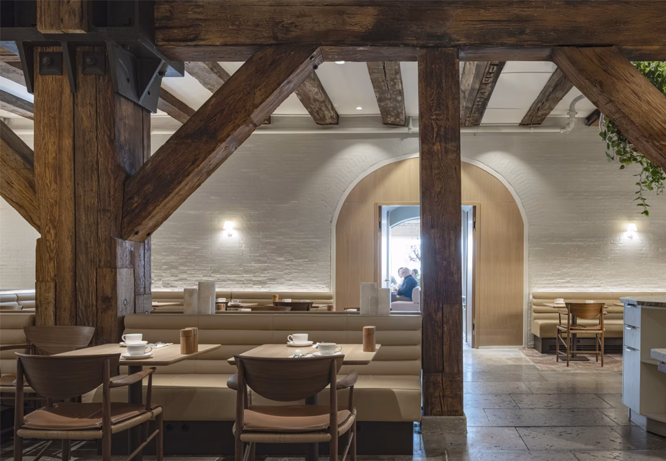 Restaurant i pakhus med fokus på fredet tømmerkonstruktion og ny fritstående stolpe. Bagerst et kig ind til pavillonen.