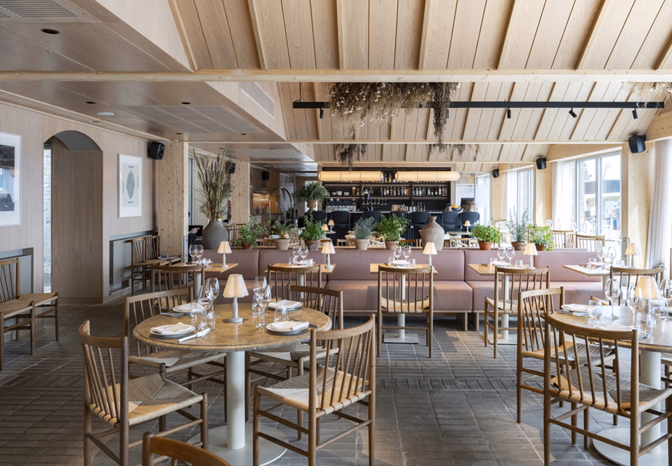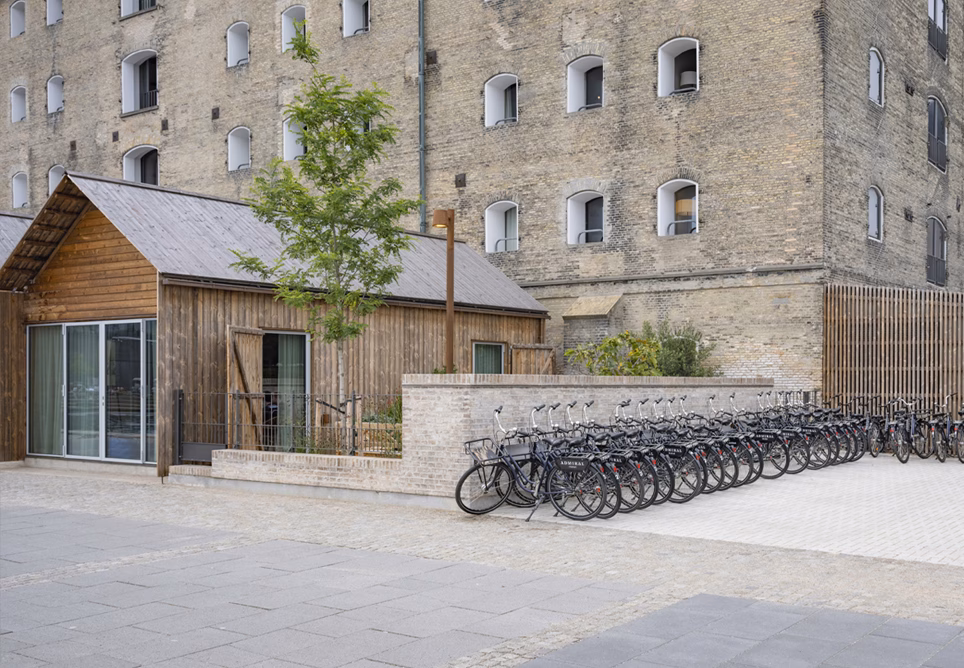 Hotellets ankomstområde, vindfang og udearealer er gentænkt. Cykel- og bilparkering er omlagt, affaldssystemer er nedgravet, og nye plinter og værn markerer overgangen til promenaden langs havnen. Indvendigt møder gæsterne nu en åben stueetage med restaurerede vinduer, portaler og gulve i tegl, egetræspaneler og fritstående træsøjler, der viderefører bygningens rå materialitet.
