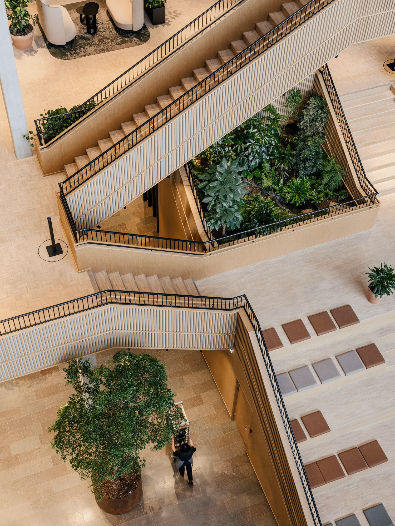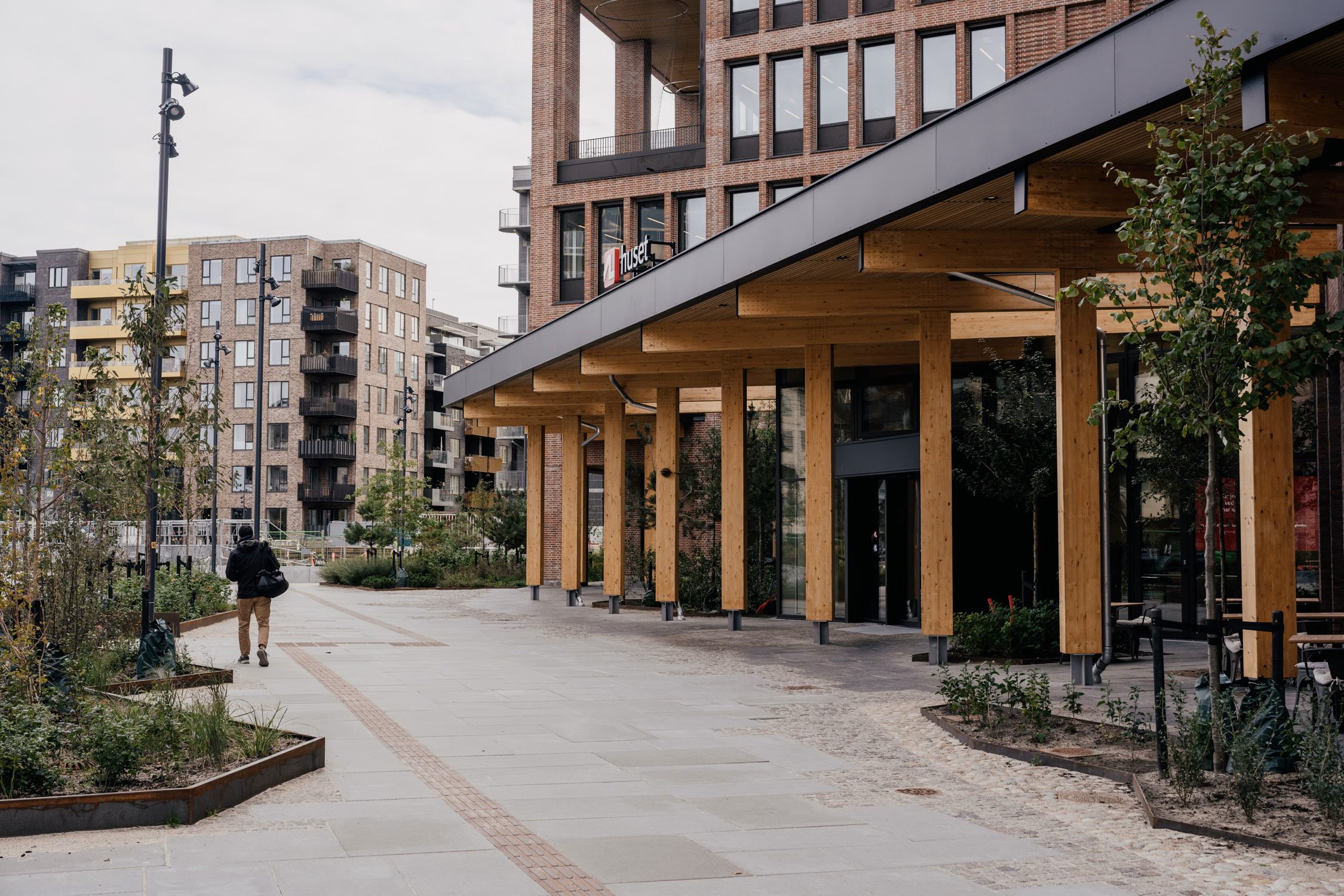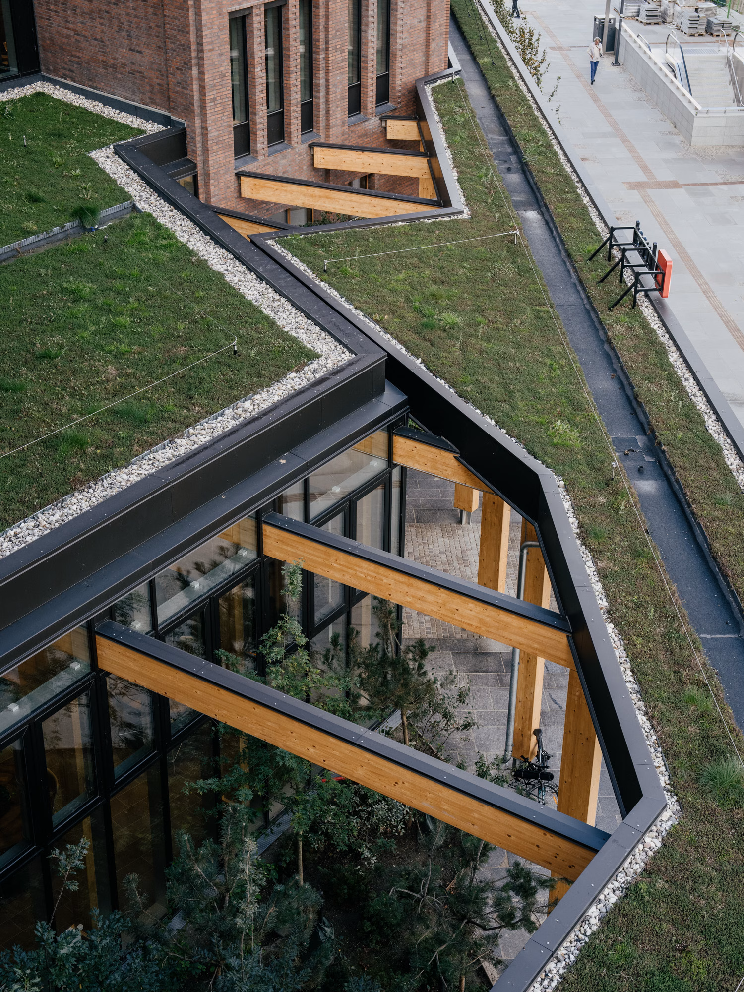 Tre bygningskroppe samles mod metropladsen af en træpavillon og et atrium, hvor beplantningen trækkes indenfor. De grønne elementer bidrager til sammenhængen mellem det offentlige ydre og det offentlige indre. Hver bygningskrop har sit eget arkitektoniske udtryk, hvilket giver huset variation og identitet, samtidig med at helheden fremstår samlet.